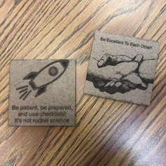 Another project the students worked on involved creating laser cut stands on thin pieces of hardboard. The stands supported board made from dimensional lumber. Students created a design on hardboard material that reflected their VW eLab Mantras, mantras that Kelman devised last semester (pictured below). The mantra board utilized one of the stands made by students, which is proudly displayed in their VW eLab currently. This project helped expose students to an authentic learning environment. This semester, Kelman added onto the mantras project by having students create coasters that reflected a specific mantra on their hardboard. The top two coasters in the design challenge are also pictured below.